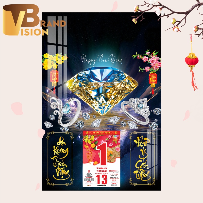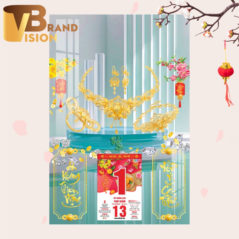 Mẫu lịch Tết in logo quà tặng LT-04 là một tác phẩm nghệ thuật đầy sang trọng. Hình ảnh chủ đạo là bộ trang sức đá quý màu xanh lam lấp lánh biểu trưng cho phú quý, sự may mắn và thành công đỉnh cao.