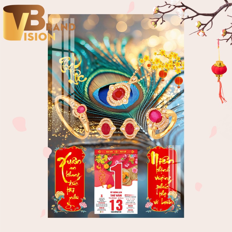 Mỗi chi tiết trên bìa lịch đều được chăm chút kỹ lưỡng, từ hình ảnh bộ trang sức đá quý màu xanh lam tượng trưng cho sự may mắn, trí tuệ đến các câu đối thư pháp “Tài Lộc” và “Tân Niên Nghênh Phước”. Tất cả hội tụ để gửi gắm lời chúc một năm mới An Khang – Thịnh Vượng.