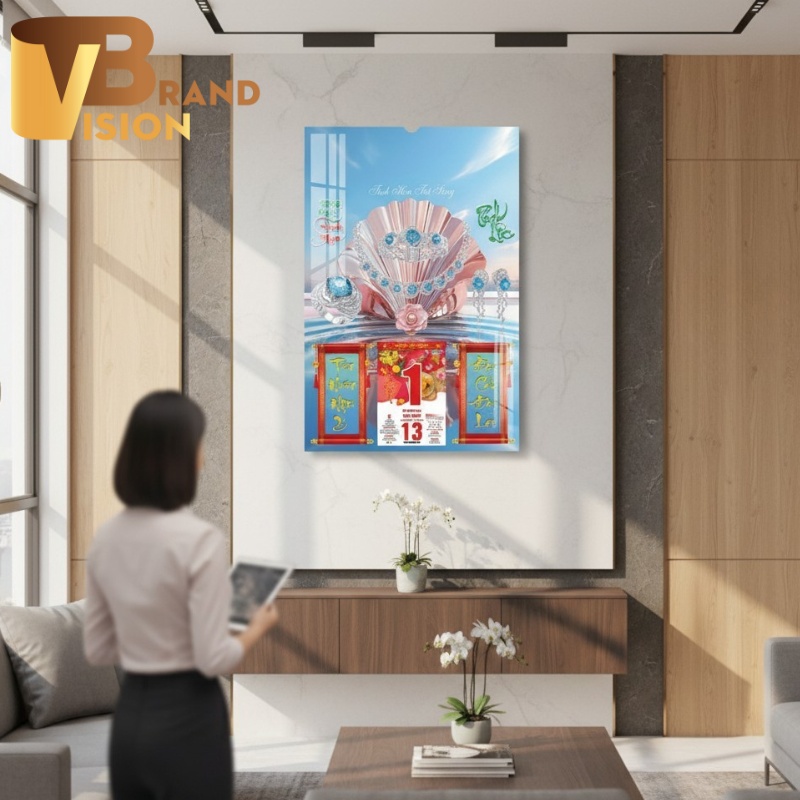 - Logo và thông điệp của doanh nghiệp được in lưới hoặc in offset chuyên nghiệp. Kỹ thuật ép kim vàng/bạc tạo điểm nhấn đẳng cấp, hài hòa tuyệt đối với chủ đề sang trọng của tấm lịch.